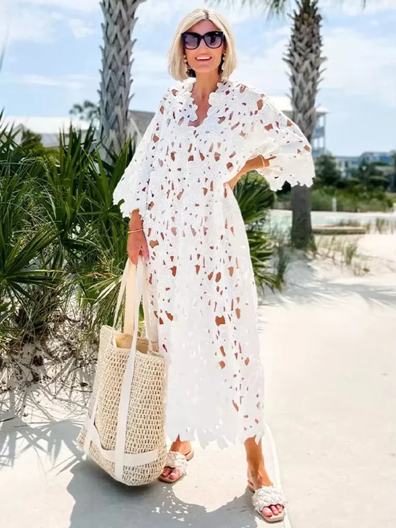 Exude effortless allure. Own the beach in style and confidence with the Sexy Lace Hollow Out V-Neck Beach Dress.